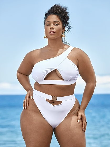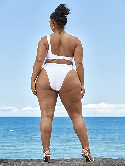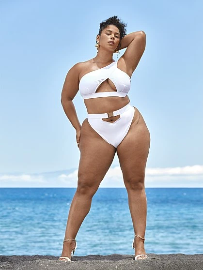 Your curves definitely won’t be compromised in this hot swim set that is perfect for FTF Babes wanting to stand out this summer. The bikini bottom has an attached belt with front cut out and a sexy hi-cut silhouette which looks so chic paired with the always beautiful shade of white. The four-way stretch quick dry fabric that provides SPF/UPF 30+ sun protection makes this a definite Add-to-Cart item. Pair with the matching one shoulder bikini top (sold separately) to complete the look. From the Tabria Majors x FTF Collection featuring swim styles that are on-trend, sexy and versatile with an emphasis on fit, sold exclusively at Fashion to Figure.