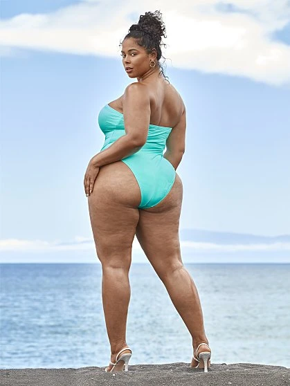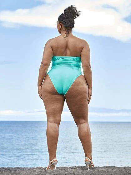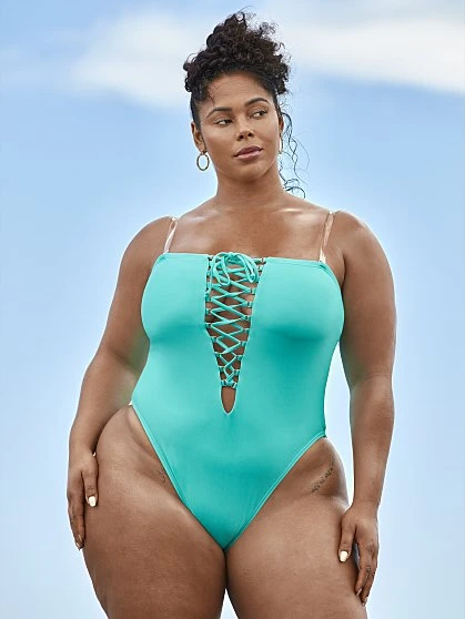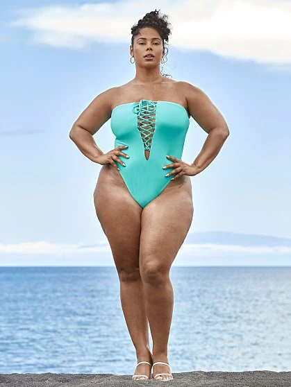 Lounge and chill poolside while wearing this classic and effortless turquoise swimsuit that has a sexy lace-up front and hi-cut panty. Pair with our’ cover-up overalls for a cute and stylish look this summer. From the Tabria Majors x FTF Collection featuring swim styles that are on-trend, sexy and versatile with an emphasis on fit, sold exclusively at Fashion to Figure.