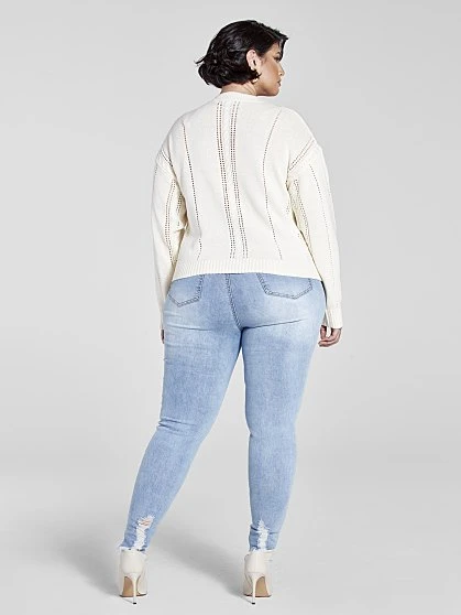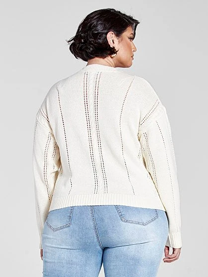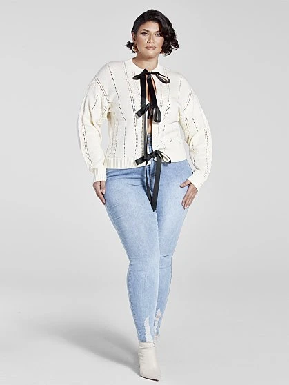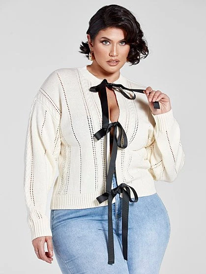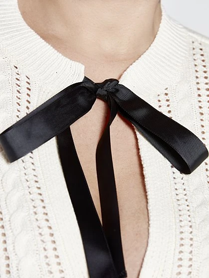 This cute cardigan has a mix of an allover pointelle and cable knit texture with a sexy ribbon ties on the front, making it a standout piece. Wear over a tank or on its own, depending on your mood. Either way, you’ll be turning heads.