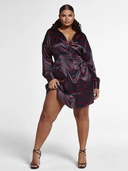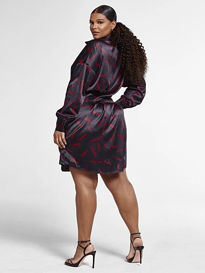 Make a style statement with this chic luxe shirt dress that has an allover text graphic print all about fashion. The deep v-neckline elevates this shirt dress silhouette to ultra sexy status. Pair with thigh high boots or heels for a gorgeous look.