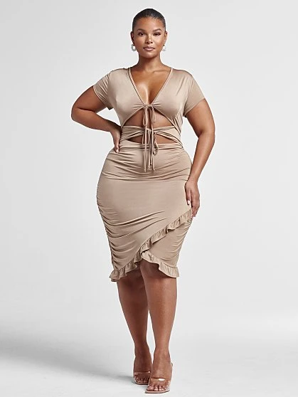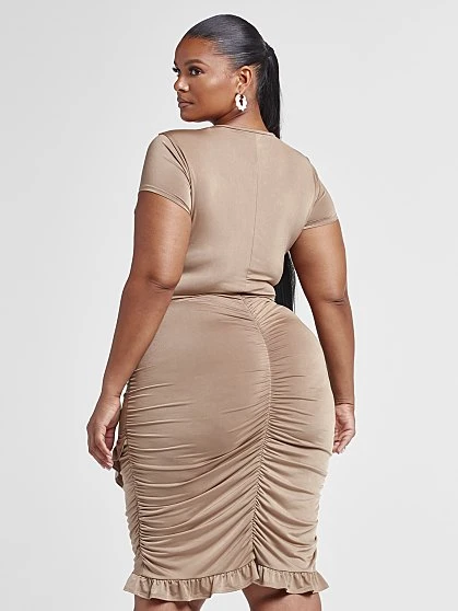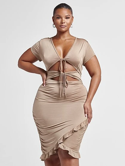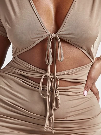 Effortless and sexy, this stunner has a double tie front that shows some skin and a cute ruffle hem skirt that has cruve-loving ruching on the back that’s guaranteed to showcase your booty just right. Pair this dress with heels to create an easy-to-wear hot look that will catch everyone’s attention.