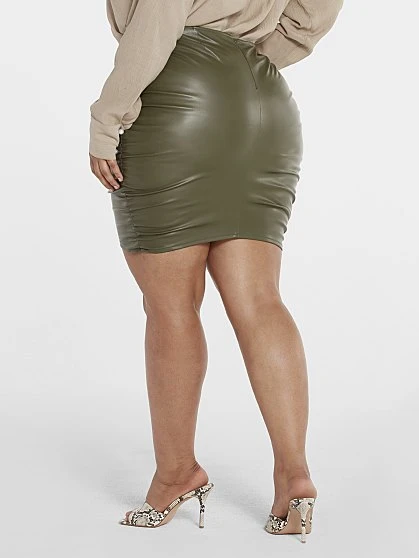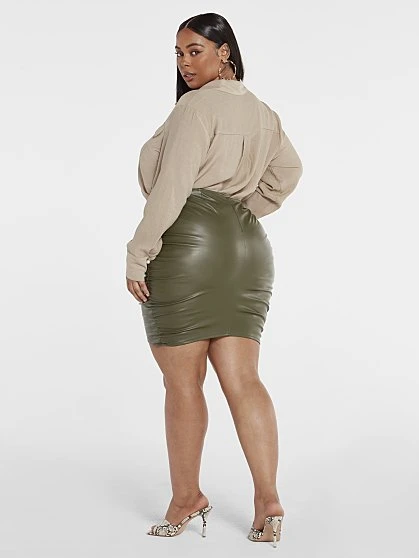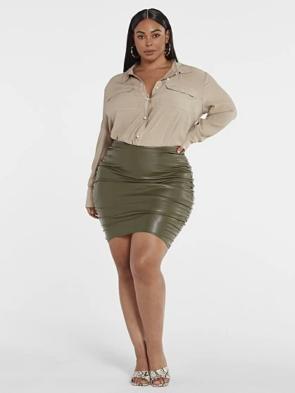 Who doesn’t love a cute and sexy skirt that’s easy to put on and go? This one’s faux leather so it’s got that edge appeal while still looking so sleek and chic. The ruching detail on the sides showcases your cruvy thicc thighs and accentuates your body silhouette. Pair with one of our button-down shirts and heels for an effortless dinner look.