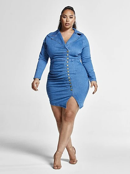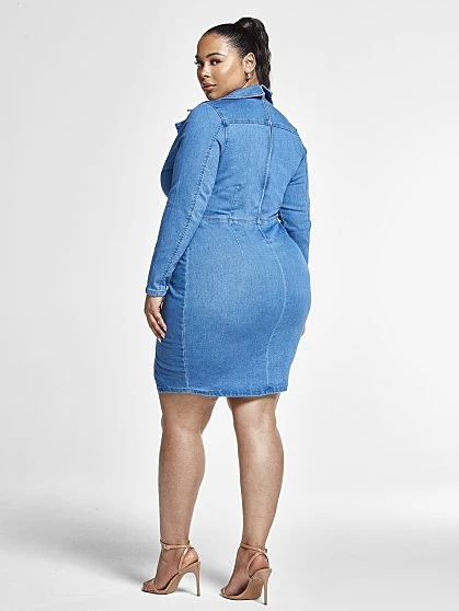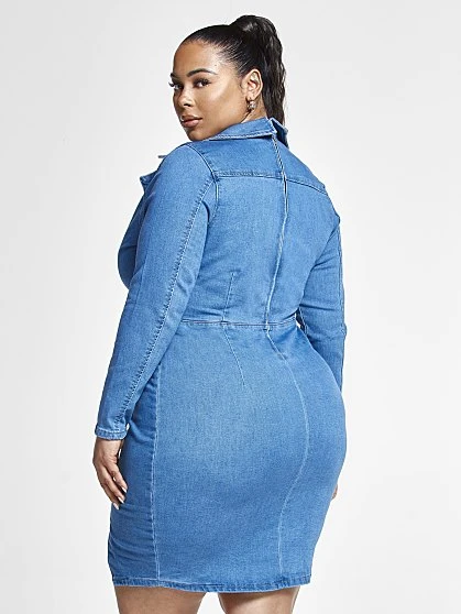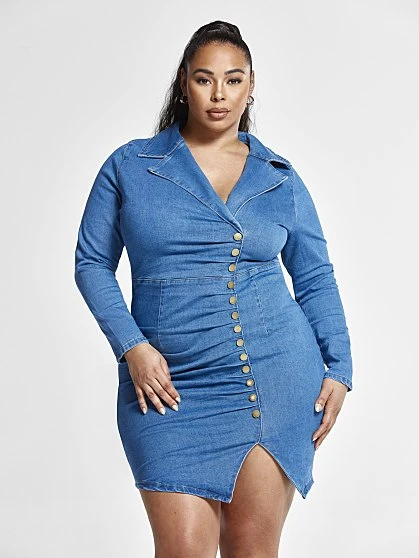 This gorgeous denim dress was made with your curves in mind. It has a chic collar neckline, a stylish asymmetrical faux button detail and a cute little side slit. Pair this effortless style with strappy heels to complete the look.