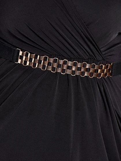 Look and feel like a queen in this stunning little black dress. With elegant draping at the hips, a gorgeous plunging neckline, and a dazzling gold belt, you will be surprisingly comfortable in this breathable stretch knit. Pair with gold earrings and a black leather clutch to complete the look.