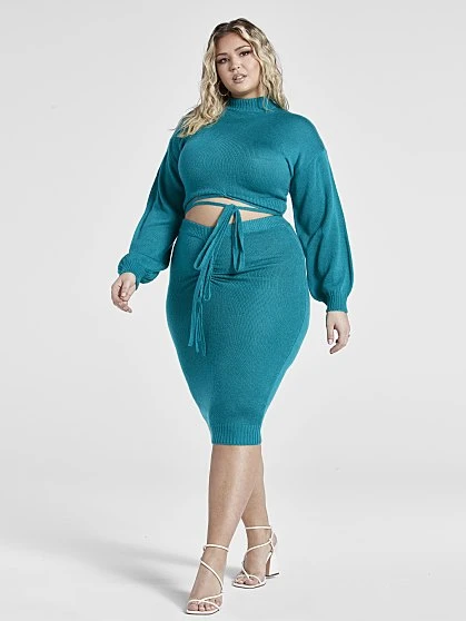Look sexy and chic but feel so cozy in this pretty sweater and skirt set. The color stands out and jewel tones are always a great idea during the holiday season. The sweater has a cropped length and tie waist detail that shows some skin in a playful way. The skirt is an effortless pull-on style with ruching detail on the front that makes the fit curve-friendly. Pair with heels or tall boots and you have the perfect comfy but elevated look to wear out or to a family gathering.