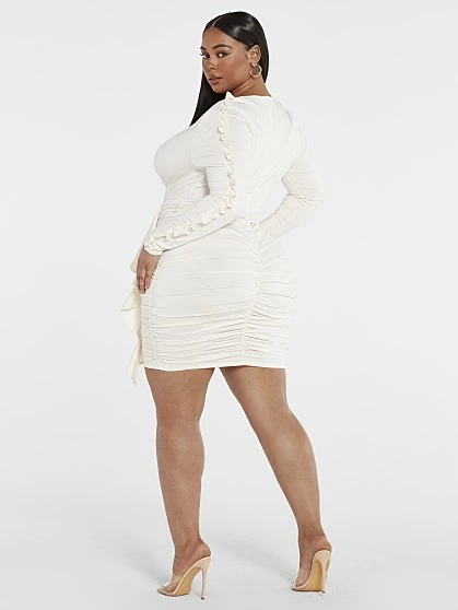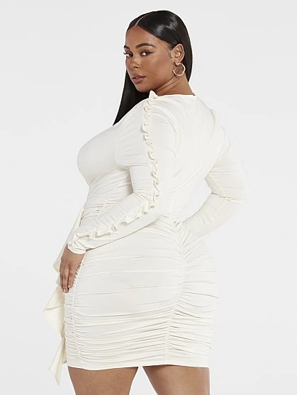 Effortless and sexy, this gorgeous dress has curve-friendly ruching on the skirt and cute ruffle detail along the sleeves and on the front of the skirt. Perfect for your next all-white event, pair this dress with heels to create a head-turning look.