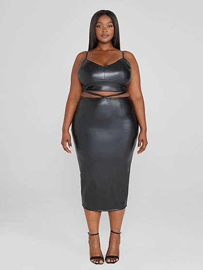 Sleek and luxe, the midi length and pencil skirt silhouette give this faux leather skirt sophisticated appeal. The criss cross waist strap detail will keep your waist looking snatched and adds a sexy touch. Pair with the Tami Faux Leather Cropped Tank Top to create a beautiful head-to-toe look.