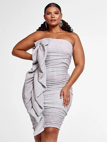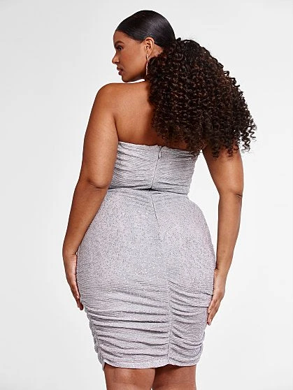 A shimmering standout, this sexy strapless silver dress definitely makes a statement when you walk into a room. The side front ruffle detail elevates this ruched style to luxe glam while the stretchy fabric makes sure you can move effortlessly. Pair with metallic strappy heels and a bold earring for a hot holiday look.