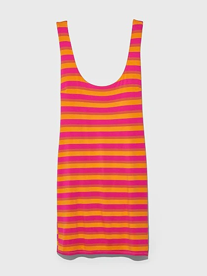 The classic tank style dress has been elevated with bold stripes and a playful tie back that gives this dress a sexy touch. Pair with your favorite sandals or sneakers to complete the look.