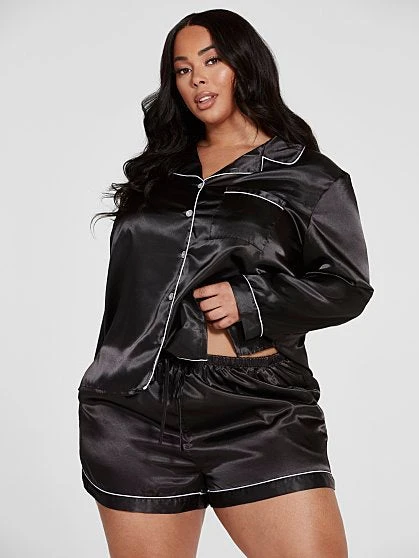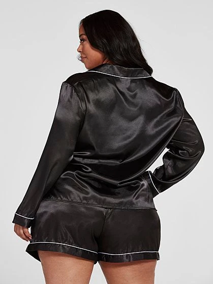 Cute and playful, this pajamas set is luxe looking, thanks to the satin fabrication. The white piping adds a chic touch. Soft and comfy, this pajamas set will make you want to stay in bed and snuggle while the included eyemask will ensure you sleep like a baby.
