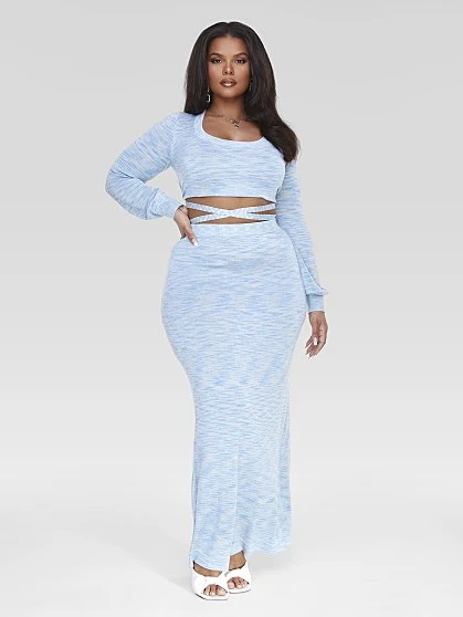Look gorgeous but feel so cozy in this spring-ready sweater and skirt set. The space dyed pattern in a beautiful light shade of blue stands out in a silhouette that hugs your curves so right. The sweater has a cropped length and tie waist detail that shows some skin in a playful way. The skirt is an effortless pull-on style in a chic maxi length. Pair with heels and you have the perfect comfy but elevated look to wear to your next spring party. Sweater and skirt sold separately.