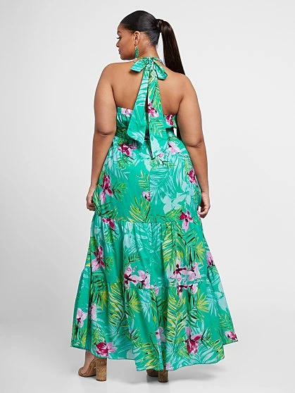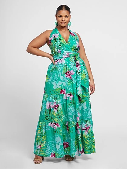 Hibiscus and palm prints brighten our must-have halter maxi dress, finished with a waist-defining self-tie belt.