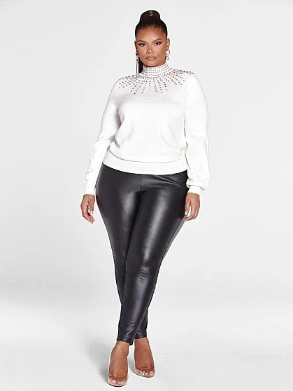 The embellished mock neckline that showcases rhinestones in a sunburst style makes this top the perfect piece to dress up any outfit this season . Pair with jeans or faux leather pants and heels or booties for a chic, sophisticated look that has a blinged out twist. The sweater knit fabric will also keep you cozy and warm. Yes, you need this sweater in your life right now.