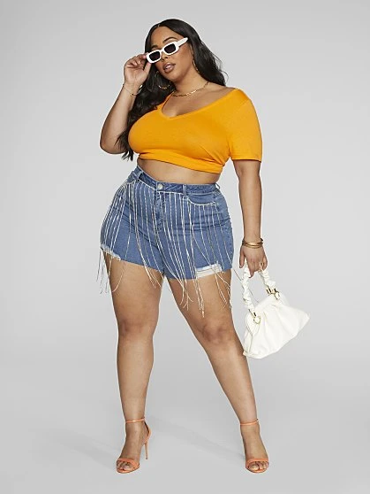 Be the first to review “Fashion To Figure High Rise Denim Cutoff Shorts With Rhinestone Fringe” Cancel reply