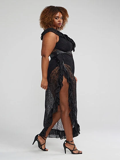 Sexy, lacy and oh-so stylish, this high slit ruffle dress is perfect to make a bold statement. With a plunging neckline, ruffled accents and a sheer look, this dress will have you channeling your inner goddess and main character energy all season long.