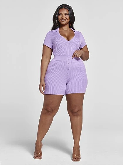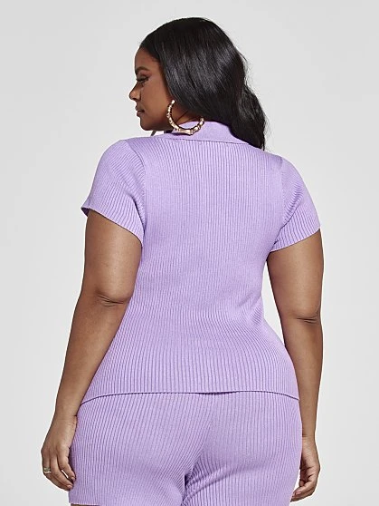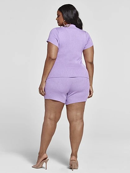 Look cute and feel comfy in this summer-ready set that shines in gorgeous (and on-trend!) lavender. Both pieces are made from a stretchy ribbed knit fabric that hugs your curves in all the right places. The polo has been given a sexy update with a plunging v-neckline and bodycon fit, while the shorts (sold separately) have a cute faux button front and easy pull-on style. Pair with some white kicks or strappy sandals to complete the look.
