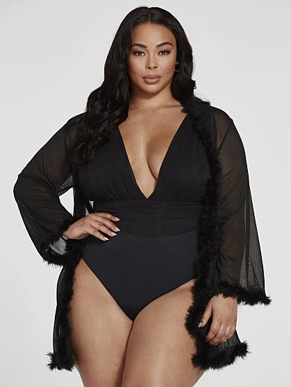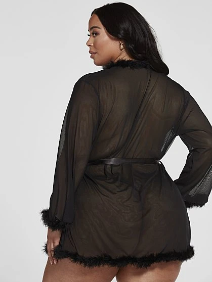 Sexy vibes! This luxe looking robe has faux fux trim paired with sultry sheer mesh fabric. The tie waist adds a cute touch. This robe is perfect for a special romantic night with someone special. Wear over a sexy bodysuit or on its own. Either way, you’ll have their attention.