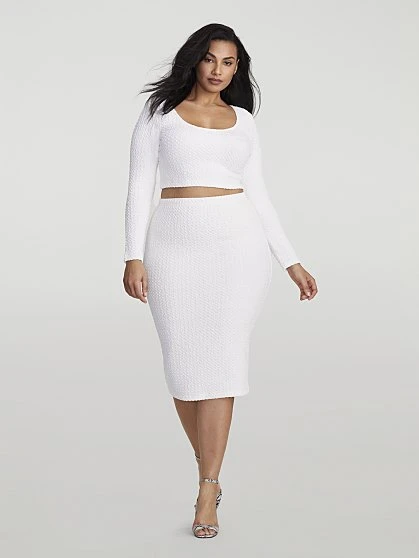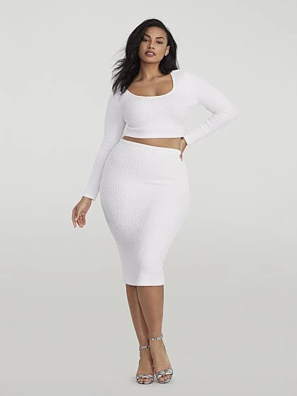 The pencil skirt is a chic closet staple and we’ve updated it this season with a fun twist, featuring a bubble texture fabric and cozy bodycon fit. Pair with the matching crop top for an all-white look that’s perfect for brunch with friends or mix and match with other pieces in your closet.