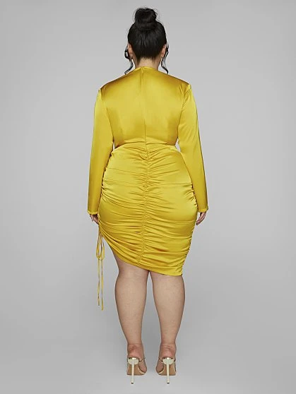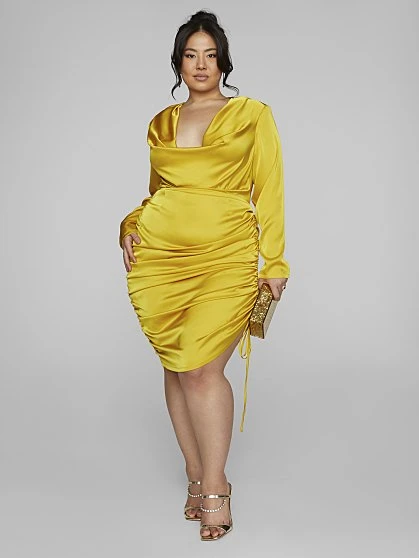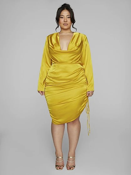 Look sophisticated and chic at your next event in this standout cowl neck dress that since in a beautiful yellow colorway. The satin-y look of the fabric makes this dress look extra luxe and the side and back ruching ensures that this dress fits your curves like a glove. The drawstring on the side lets you control the style of your hem, depending on your mood. Pair with open toe heels, gold accessories and a clutch to complete the look.