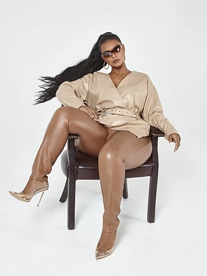Sleek, luxe and chic, this faux leather wrap style jacket is #FTFBabe perfection. The removeable belt adds a stylish touch. Pair with skinny jeans or our faux leather leggings and heels for a statement-making look.