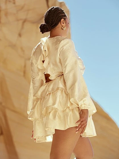 So beautiful and romantic, this stunning tiered dress has a sexy open back with cascading ruffle trim. The floral print detail on the satin fabric looks luxe and elevated, making this dress the perfect look for your next special occasion. Brides-to-be, if you’re looking for a second dress to wear to your reception that stands out, this dress is perfect for that too! This is a dress you can wear to so many different occasions. All you need are the right shoes and accessories and you’re all set.