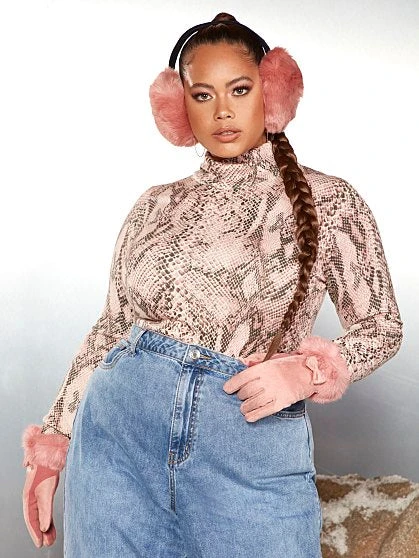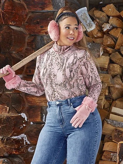 Snake print is so hot right now and looks perfect paired against a blush pink background on this cozy turtleneck sweater. Just pair with jeans, our long faux fur vest and boots for the ultimate ski look that’s fun and chic.