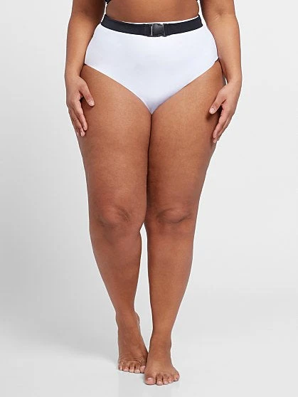The black belt on this solid white bikini bottom gives this swim separate a chic touch while offering high waist support. Made from a 4-way stretch tricot, pair with the Khloe Short Sleeve Crop Swim Top for the perfect sexy poolside look. The new swimwear collection from FTF features 4-way stretch ultra soft strong fabric that provides SPF/UPF 30+ protection, resists chlorine with quick dry no wrinkle or shrinkage technology.