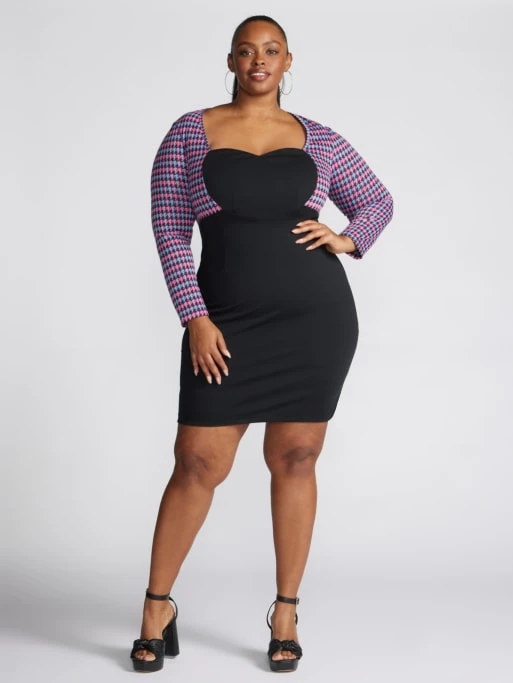 Show the world how much you love YOU in this eye-catching bodycon dress, designed with a three-dimensional heart panel on the front and a pretty multicolor houndstooth print on the sleeves and back of top. Pair with hot pink pumps and purse to complete the look.