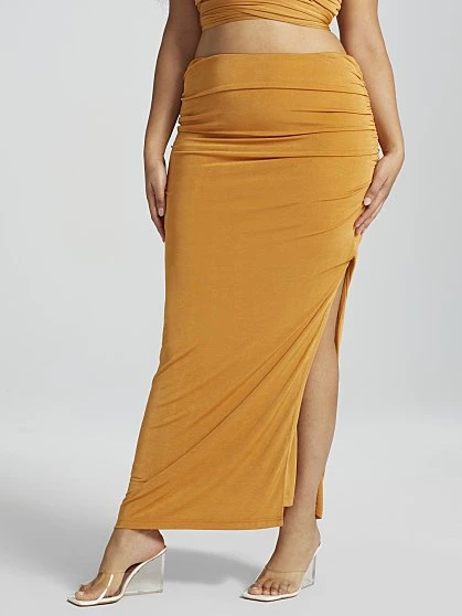 Designed for a comfortable fit with a curve-friendly side ruched effect, this maxi skirt is the epitome of Chic Girl Summer. The shimmery finish gives it a luxe touch. Pair with the matching shimmer top to create a stunning head-to-toe evening look. .