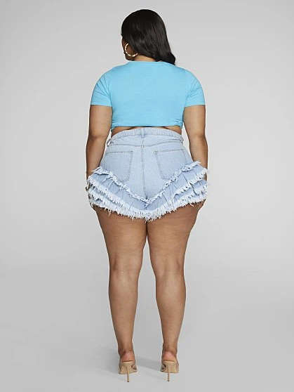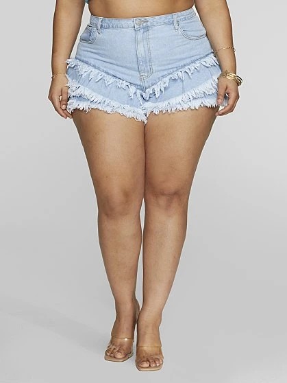 Come on thru, sexy! These light wash denim shorts will have you looking extra cute this summer. Show off your thick thighs in these playful bottoms that have a tiered fringe detail at the hem. Pair with a tank top or cropped tee to complete the look.