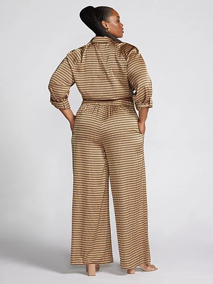 The classic wide leg pant gets a trendy upgrade with a sleek geometric print and high waist. Wear with the matching shirt tied in a knot in the front and heels for a dinner date with friends.