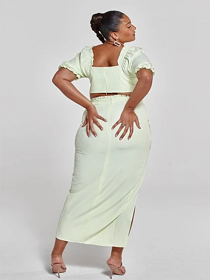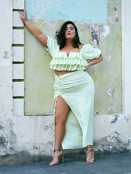 It’s the ruffles for us. This cute set will quickly become your favorite go-to when needing a quick outfit to wear to any day event that calls for a stylish and fun vibe. The top has a pretty three-tier ruffle detailed front, sexy cropped length and cute elbow length sleeves. The matching maxi skirt (sold separately) has pretty ruffle detail and a side drawstring that lets you control the length of the side slit and the ruching detail. These separates also can be mixed and matched with other pieces in your wardrobe. From the Nadia Aboulhosn x FTF Collection featuring effortless, romantic styles that are sexy, chic and versatile, sold exclusively at Fashion to Figure.