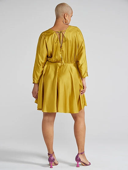 You’ll stand out in this gorgeous dress that has a satin look and feel and shines in a beautiful yellow colorway. The color alone is perfect for Spring and the drape on this dress is pure perfection. So effortless and luxe, this dress is just waiting for you to wear it to your next party. Just add some colbalt blue heels and a gold metallic clutch to complete the look.