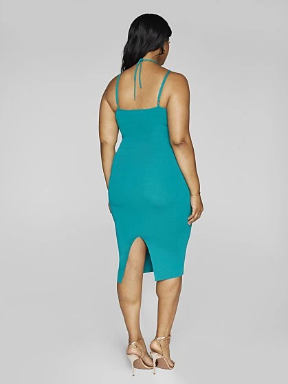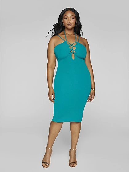 Made from a soft and stretchy lightweight sweater knit that’s perfect for summer, this stunner is sleek and sophisticated with a touch of sexy. Lynae shines in a summer-ready bright green colorway with lace-up details and straps that offer a playful vibe. The bodycon fit coupled with the midi length gives it a chic look. Pair with open toe heels and a gold clutch to complete the look.