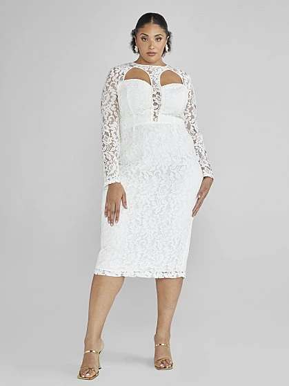 Be the center of attention in any room you walk into while wearing this white lace dress that definitely makes a statement. The cutout details add a sexy touch against the delicate lace fabric while the bodycon fit is sleek, hugging your body just right. The midi length adds sophistication to the mix, making this dress a must-have for your next holiday party or any occasion that calls for something extra fancy.