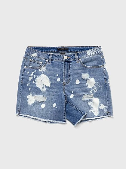 Paint splatter detail adds some edge to these cut off jean shorts. Pair with an easy tee and sneakers to complete the look.