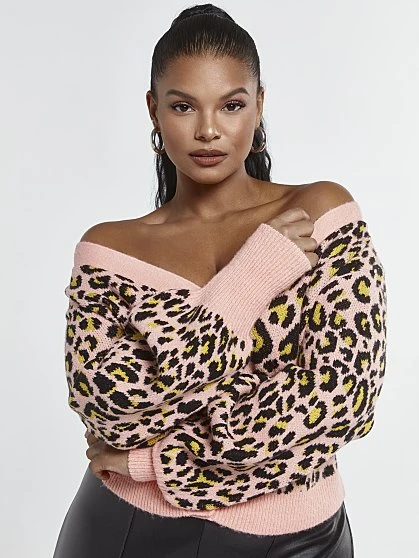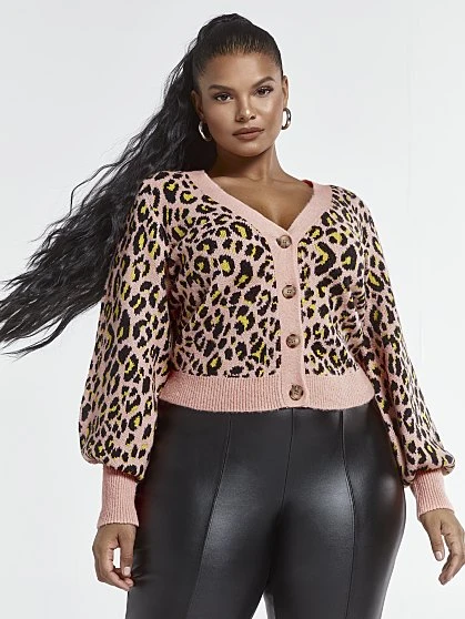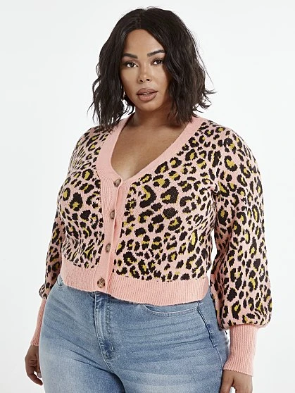 The classic cardigan remixed! This must-have style has a cropped length and gorgeous pink leopard print with hints of neon green that pops. The lantern sleeves add a chic vibe. Pair with our flare leg jeans for a playful fall look.
