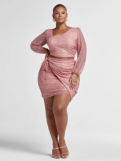 Sexy and so chic, this ruched skirt is a definite must-have. Featuring a side tie detail and sexy ruching throughout, this pink skirt is not your basic lace separate. Pair with the matching top for a hot unforgettable look.