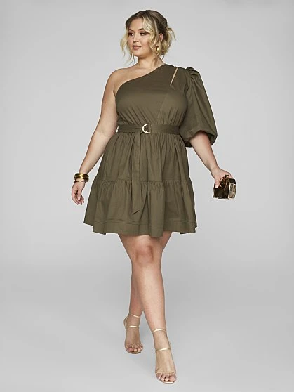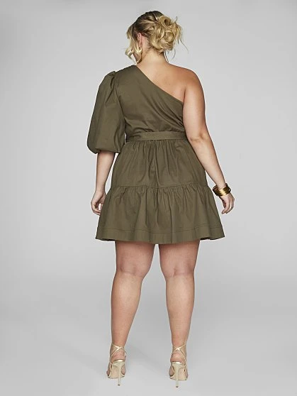 Military-inspired with a twist, this gorgeous olive one shoulder dress brings the drama and will have you making a statement when you walk into a room. The belt snatches your waist and the pretty ruffle hem softens the silhouette with a feminine touch. Pair with gladiator sandals and a gold clutch to complete the look.