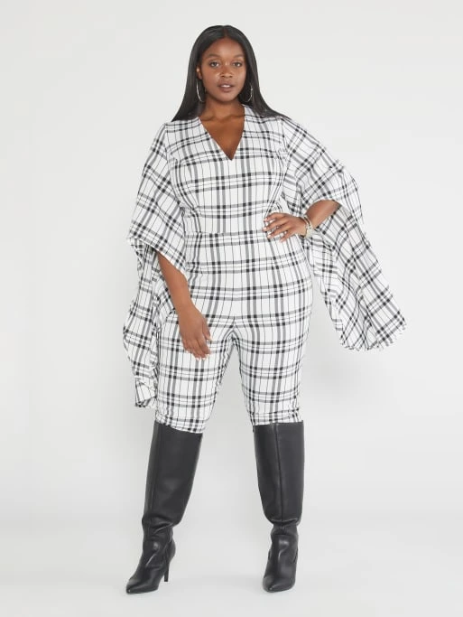Plaid is bringing the drama this season in this gorgeous batwing sleeve jumpsuit that definitely makes a statement. Classic black and white never looked this good and the drape on those sleeves are everything. The v-neckline adds some sexiness. Pair with tall boots and gold accessories to create a head-turning look.