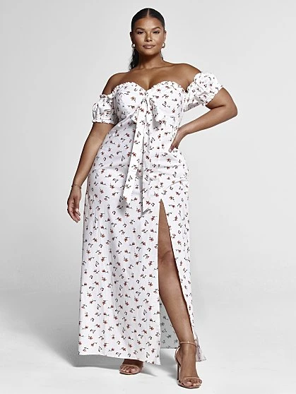 You’ll fall in love with the delicate floral pattern on this summer-ready maxi dress that’s so eye-catching and pretty. The puff sleeves, sweetheart neckline and maxi length give off a romantic vibe while the high slit adds a sexy touch. Wear on its own in the warmer months with strappy sandals or pair with a denim jacket and white sneakers for those days when it’s a little chilly. From the SRV x FTF Collection featuring elevated summer-ready styles that are sexy, effortless and chic, sold exclusively at Fashion to Figure.