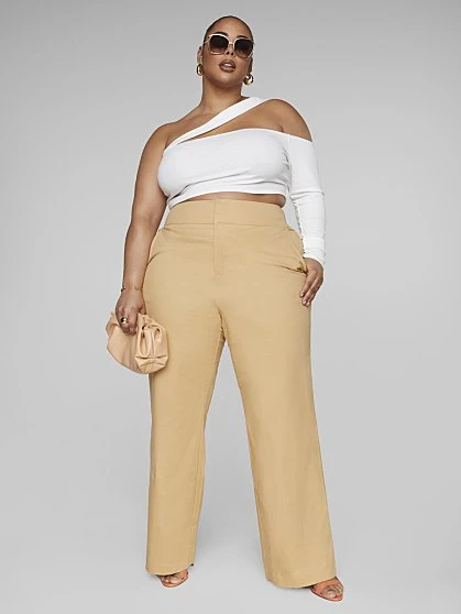 So chic and sleek, these tan wide leg pants can be dressed up or down and can be worn from season to season effortlessly. Pair with a button-down shirt tied in the front and strappy sandals for a laidback summer look. From the Gabi Fresh x FTF collection, a colorful collection of wear-now versatile pieces that focus on quality, fit and effortlessness.