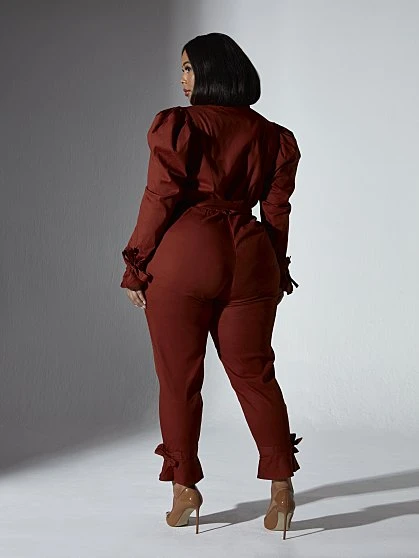 A chic and bold red jumpsuit, perfect for your Fall wardrobe. Featuring long puff sleeves, ties at sleeve hems and ankles plus a self-tie belt, it’s a must-have. Pair with strappy sandals or heels for a great dinner look.
