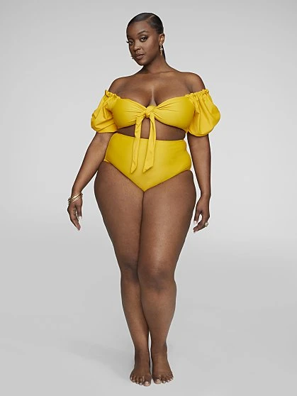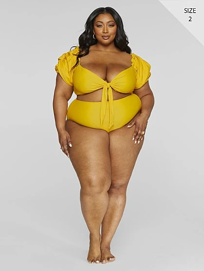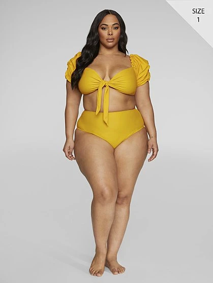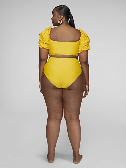 Shine in this stunning yellow two-piece swimsuit that’s chic and Parisian-inspired. The top has gorgeous short puff sleeves that can be worn on or off the shoulders and an adjustable tie front that ensures the fit is on point. The matching brief (sold separately) has a high waist and full brief coverage. Featuring our innovative and functional four-way stretch fabric that’s ultra-soft yet strong, the quick dry fabric provides SPF/UPF 30+ sun protection, resists chlorine and is wrinkle-free and shrinkage-free.