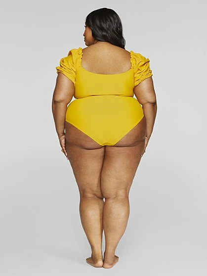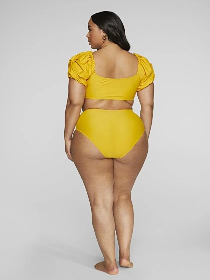 Shine in this stunning yellow two-piece swimsuit that’s chic and Parisian-inspired. The top has gorgeous short puff sleeves that can be worn on or off the shoulders and an adjustable tie front that ensures the fit is on point. The matching brief (sold separately) has a high waist and full brief coverage. Featuring our innovative and functional four-way stretch fabric that’s ultra-soft yet strong, the quick dry fabric provides SPF/UPF 30+ sun protection, resists chlorine and is wrinkle-free and shrinkage-free.