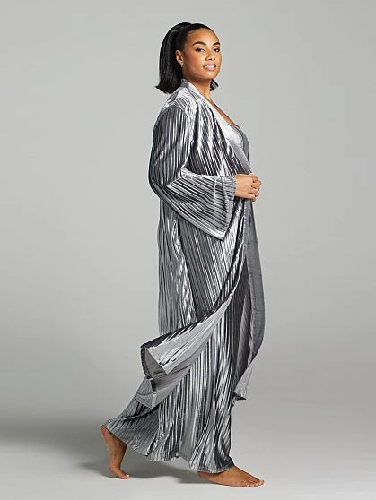 Designed with all-over pleats in a soft and luxe velvet, this duster adds a sophisticated touch to any look. Pair with the matching bodysuit and pants (sold separately) to create an effortless statement holiday look this season.