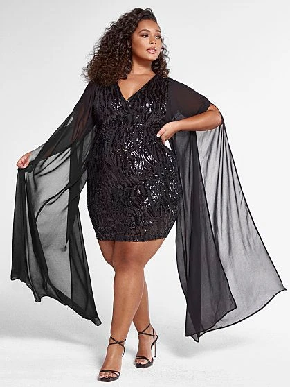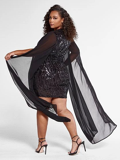 Show up and show out in this gorgeous and chic sequin dress that’s holiday party ready. Featuring see-through long flowy mesh sleeves that has a cape-like feel, this curve-hugging dress is a must-have. Pair with stilettos and a sleek clutch to complete the look.