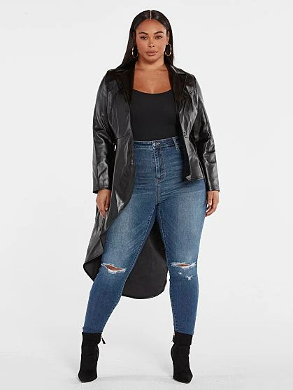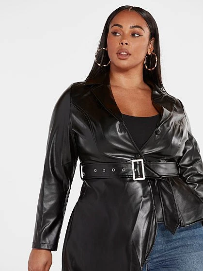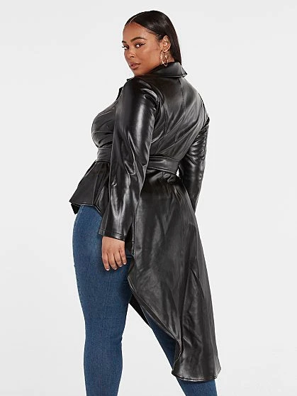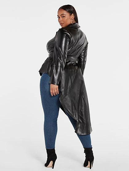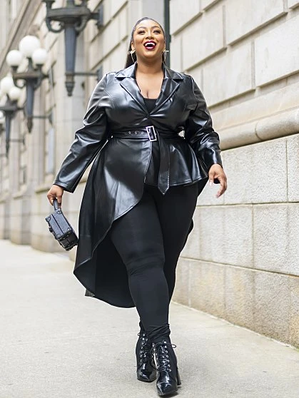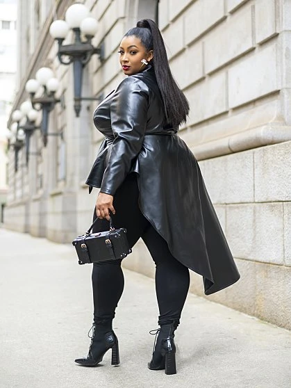 The latest FTF LAB collaboration with influencer and model Nzinga Imani focuses on the essential faux leather jacket reimagined to reflect her adventurous personality and fun style. Her jacket is named Star Status for a reason; you’ll feel like a star whenever you wear it. Luxe and sleek-looking, this jacket offers a sexy peplum silhouette and belt at the waist that keeps you snatched while the asymmetrical hem is fun and playful. Wear the jacket over a top or on its own closed with skinny jeans and booties. FTF LAB 005 by Nzinga Imani focuses on an essential outerwear style that makes a statement with its gorgeous silhouette and luxe looking faux leather, inspired by her journey to finding on-trend clothing she loves in her size.