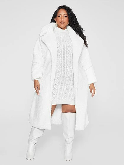 Look luxe in white this winter, giving off all the rich vibes, in this gorgeous faux fur coat. Super cozy with a nice long length, this coat features a chic belt that cinches you at the waist, giving this coat a stylish feel. Create a stunning head-to-toe white look with our Kendra Sweater Dress and white knee high boots.