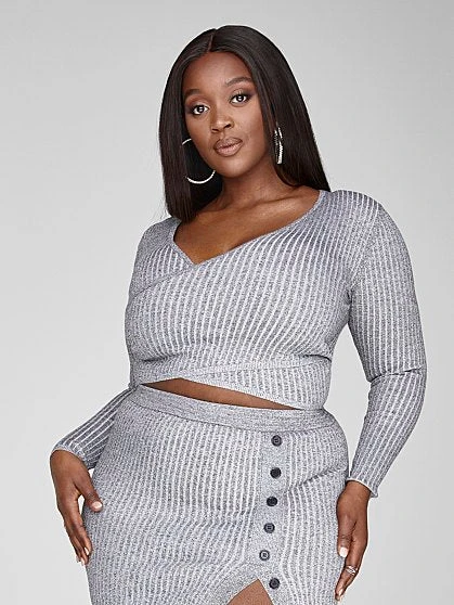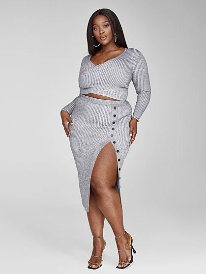 A comfy set that’s chic and sexy?!? Yes, please! The marled yarn fabric elevates the color from a basic shade of grey and is so soft with lots of stretch. The top has a faux wrap style that keeps you snatched and looking polished. The skirt has an easy pull-on style with a sexy high side slit and pretty faux button detail. Wear together with heels for a dinner date or mix and match these pieces with other styles in your closet. Top and skirt sold separately.